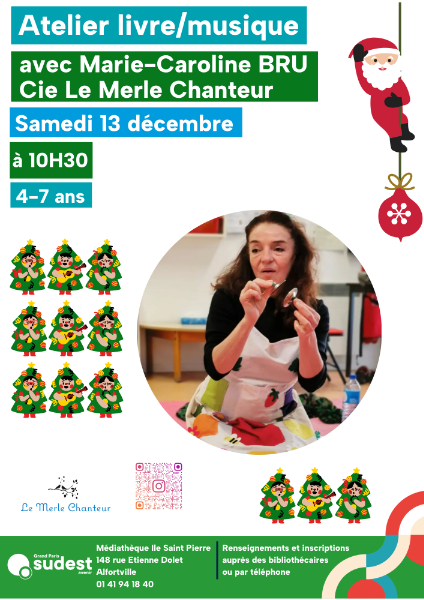 Un atelier qui donne envie de vivre le livre en musique par des chansons et des mouvements dansés réalisés par Marie-Caroline Bru, une chanteuse-conteuse qui ravira vos oreilles autour de la thématique de Noël.