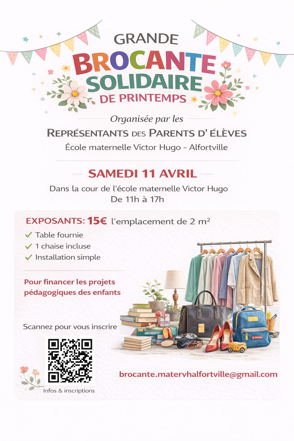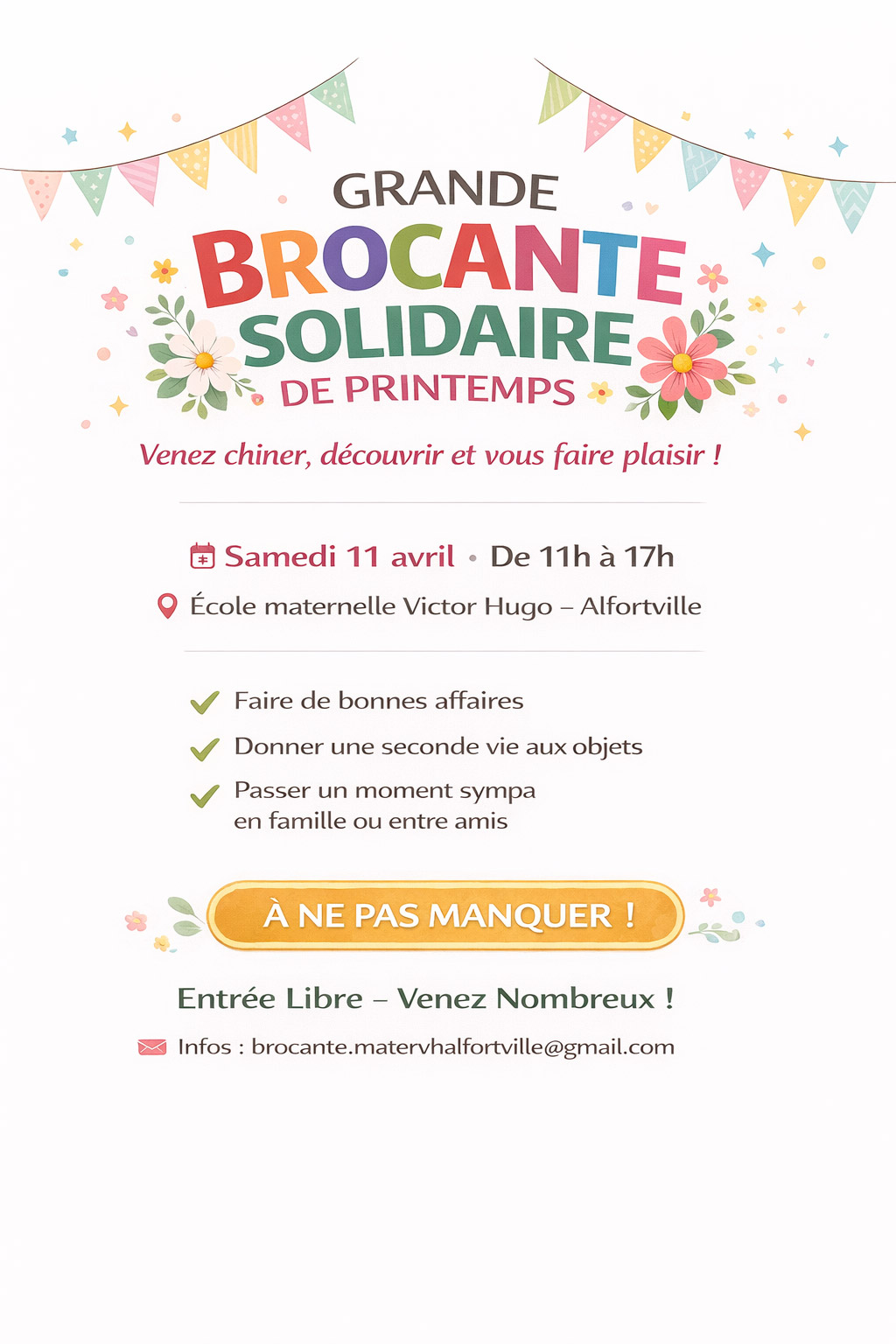 Les représentants des parents d’élèves de l’école maternelle Victor Hugo organisent une grande brocante solidaire de printemps, le samedi 11 avril, de 11h à 17h, dans la cour de l’établissement à Alfortville. Ouvert à tous, cet événement vise à collecter des fonds pour financer les projets pédagogiques des enfants.