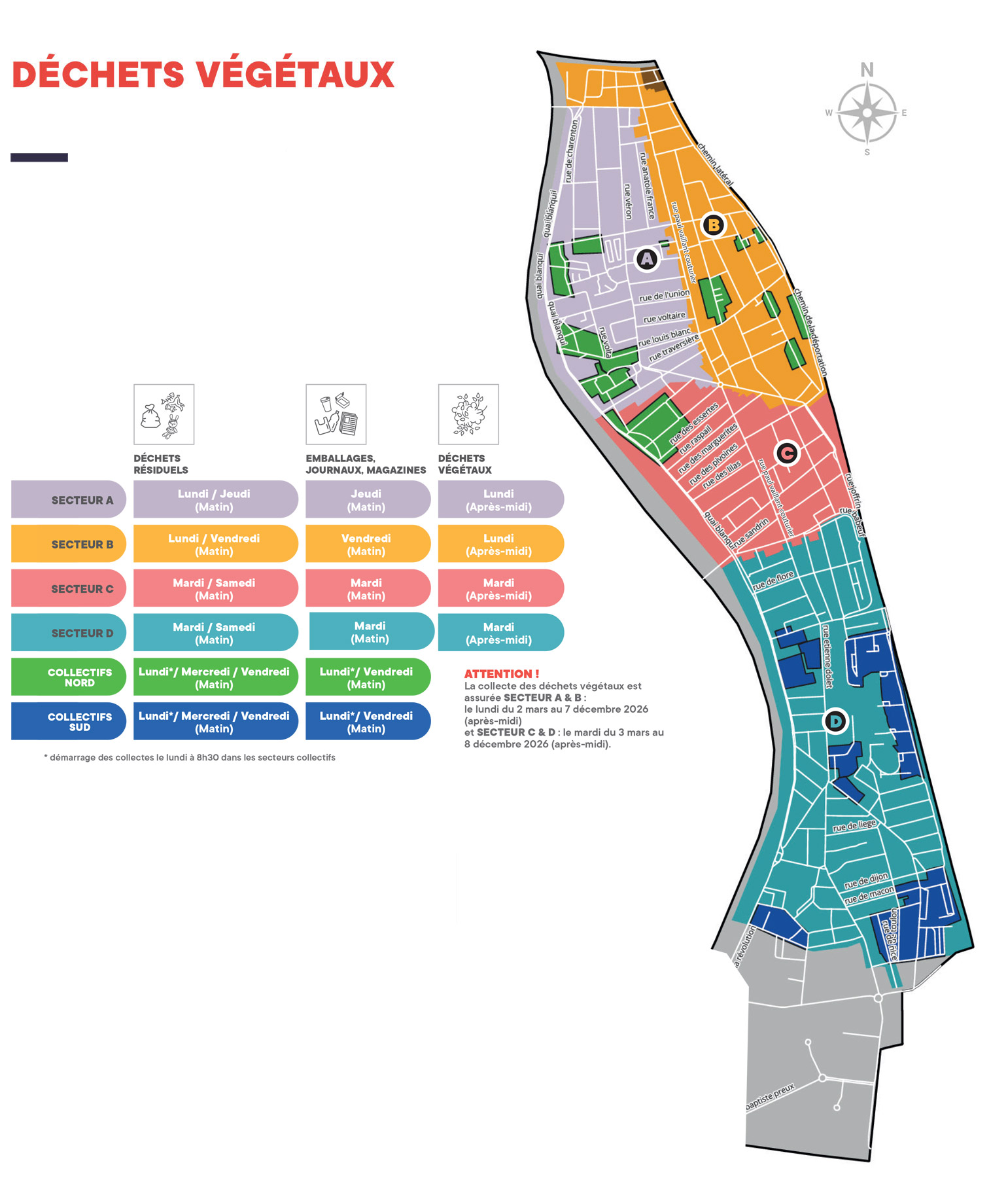Les tontes de gazon, les branchages ficelés en fagots, les feuilles, plantes et fleurs fanées sont collectés dans certains quartiers de la mi-mars à la mi-décembre selon les calendriers de collecte.
