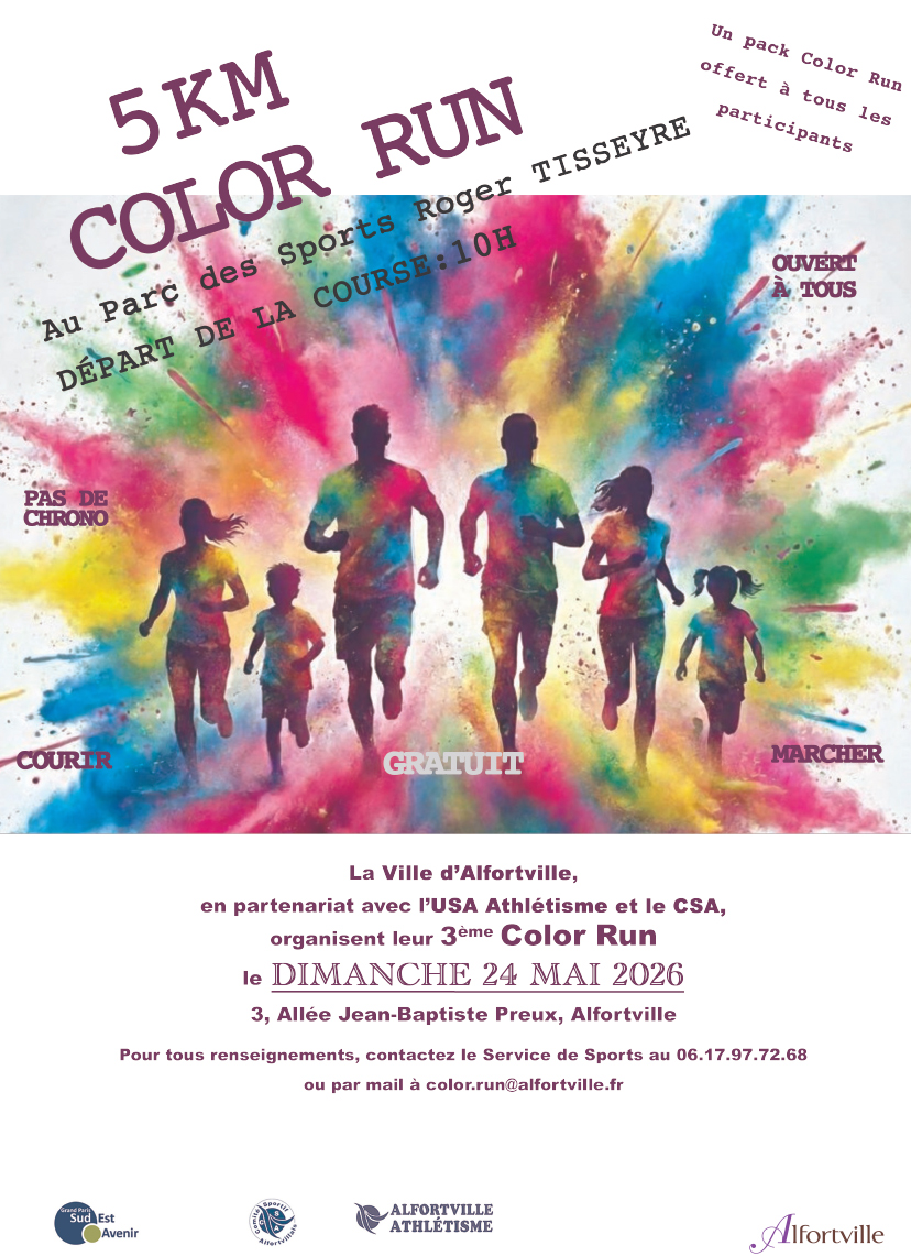 Pour tous renseignements, contactez le Service de Sports au 06.17.97.72.68 ou par mail à color.run@alfortville.fr