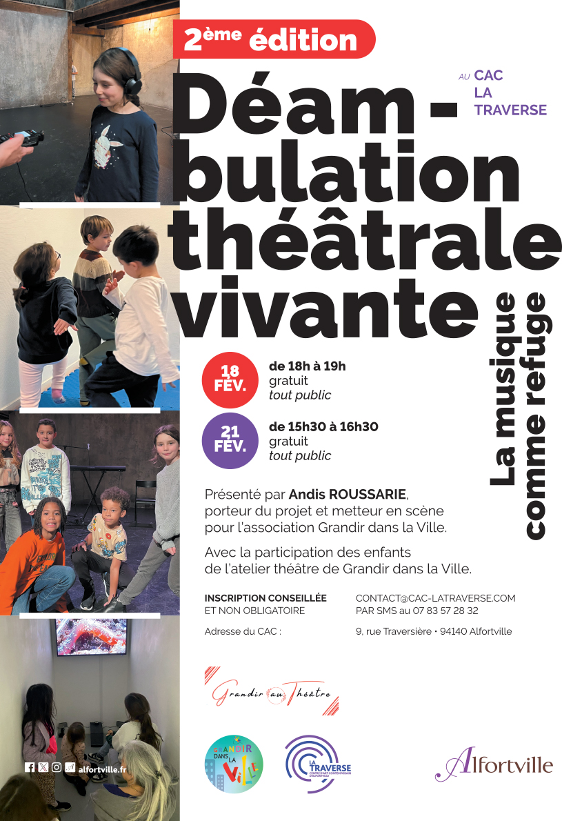 CAC La traverse propose la 2ᵉ édition de Déambulation théâtrale vivante, un projet artistique mené par Andis Roussarie, porteur du projet et metteur en scène, avec la participation des enfants de l’atelier théâtre de l’association Grandir dans la Ville.