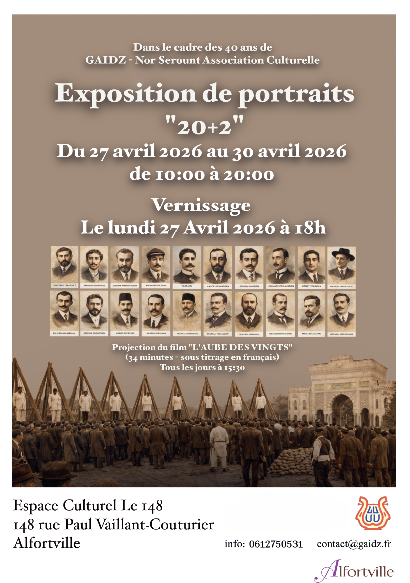 Dans le cadre de son 40ème anniversaire, l’association GAIDZ – Nor Serount Association Culturelle présente l’exposition de portraits « 20+2 », du 27 au 30 avril 2026.