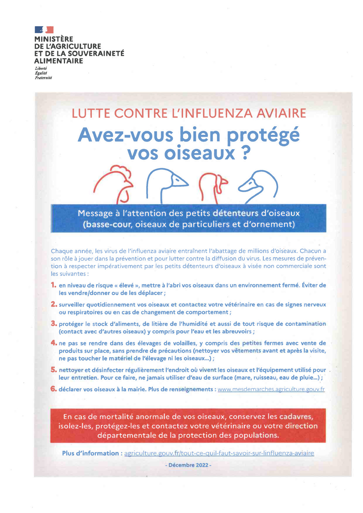 Pour plus d’informations et pour consulter l’intégralité des mesures, veuillez consulter le site du Ministère de l’Agriculture et de la Souveraineté Alimentaire : [agriculture.gouv.fr/tout-ce-quil-faut-savoir-sur-linfluenza-aviaire].