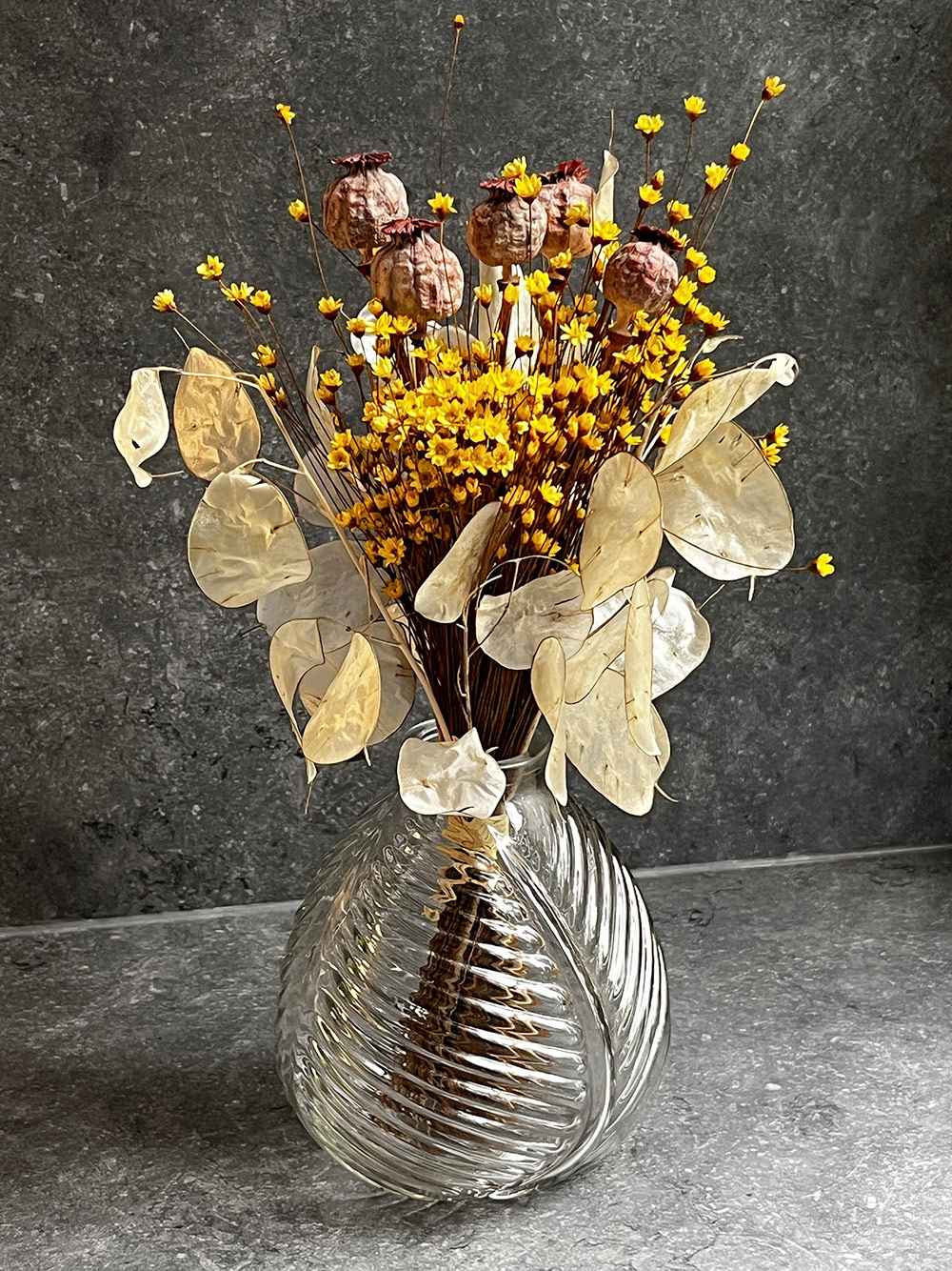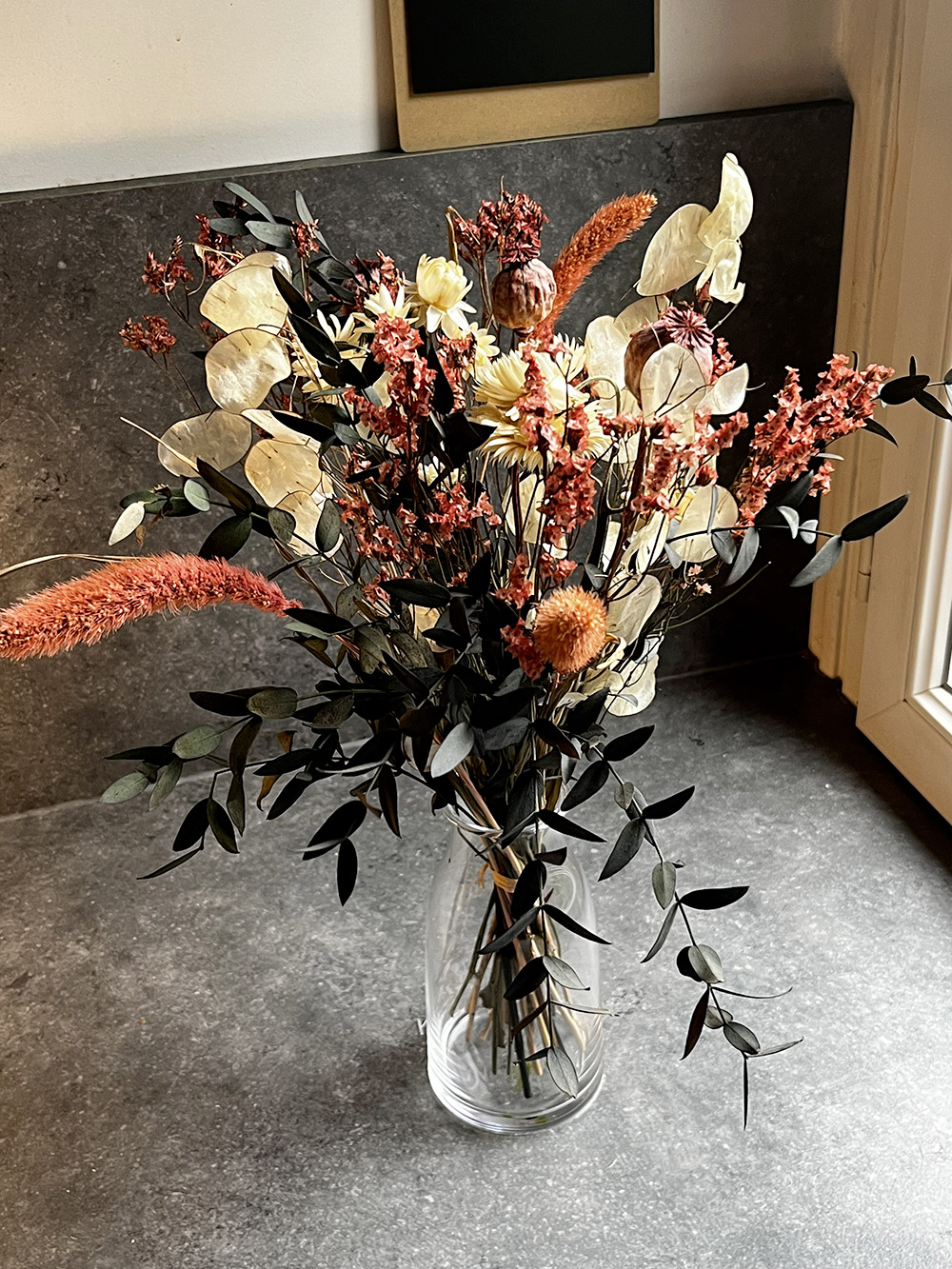 Véronique propose des compositions décoratives poétiques et atypiques réalisées à partir de fleurs séchées et stabilisées.